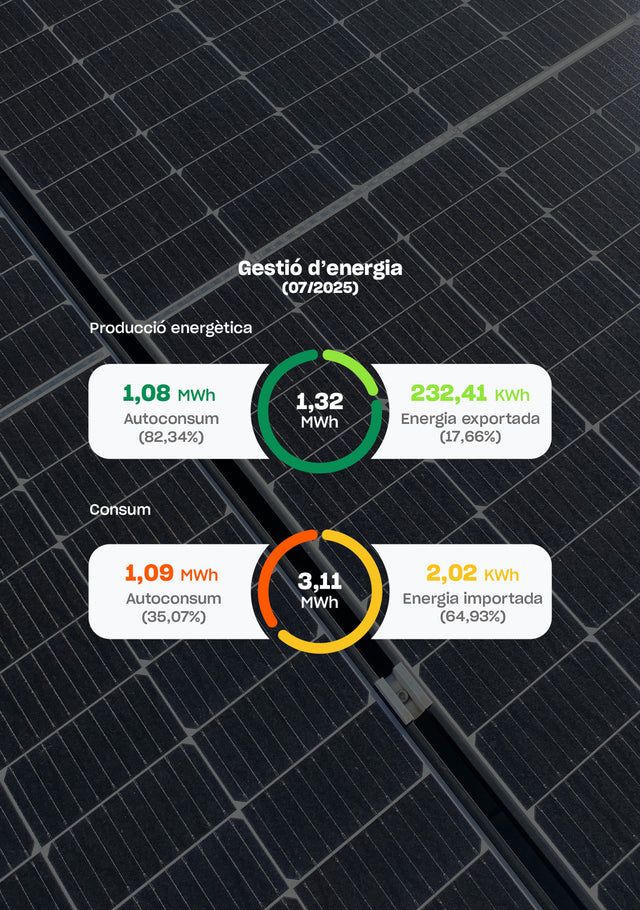 El 2025, hem fet un pas més. Hem instal·lat les nostres primeres bateries per emmagatzemar l'energia solar que generem i augmentar la nostra autosuficiència. A més, hem començat a monitoritzar el nostre consum elèctric en temps real mitjançant un quadre de comandament digital. Per exemple, només el juliol de 2025: